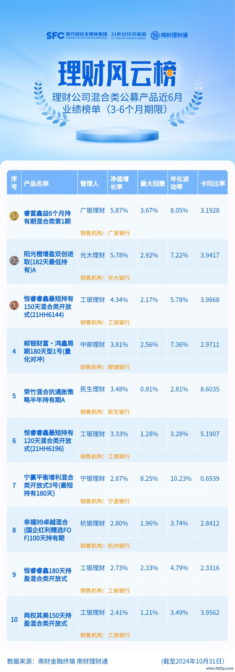 南财理财通数据显示,截至10月31日,理财公司符合统计要求的3-6月(含)混合类公募产品共有86只。从整体风险收益水平看,3-6月(含)混合类公募产品近半年平均收益率为1.62%,近半年最大回撤和年化波动率分别为1.38%和2.55%。