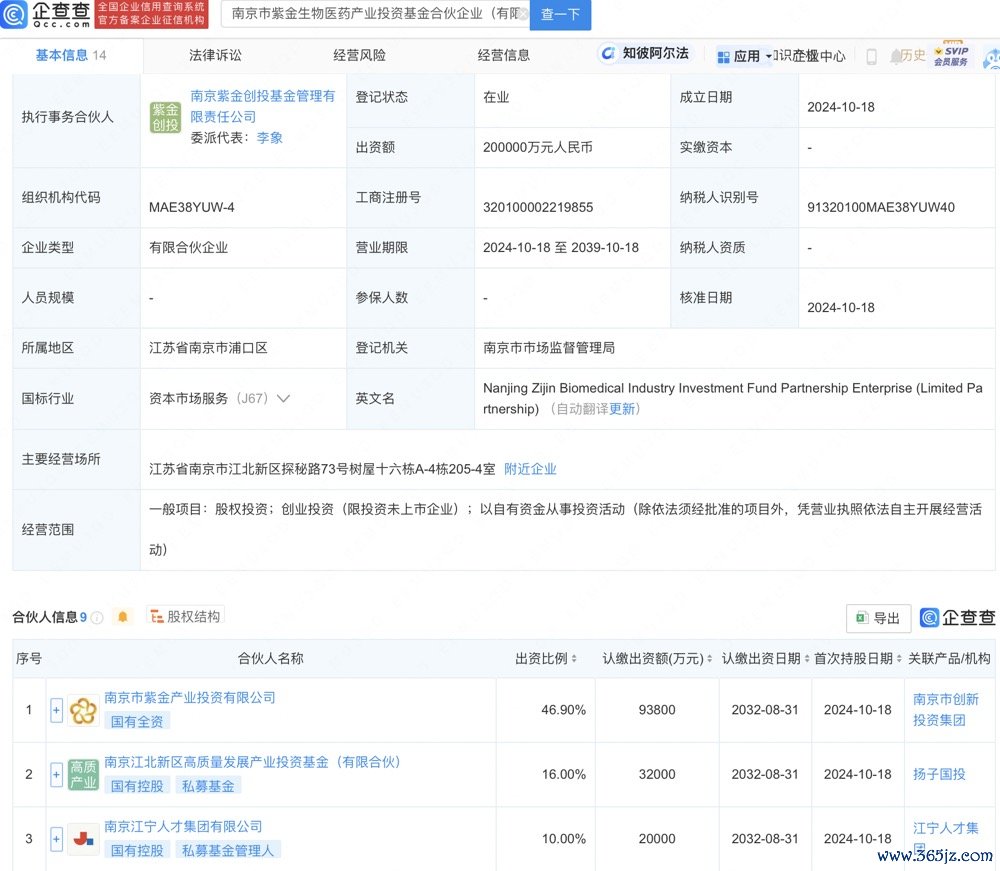 上证报中国证券网讯企查查APP显示,近日,南京市紫金生物医药产业投资基金合伙企业(有限合伙)成立,执行事务合伙人为南京紫金创投基金管理有限责任公司,经营范围包括股权投资、创业投资、以自有资金从事投资活动。